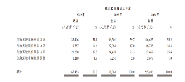 从业务线划分,驭势科技营收主要来自自动驾驶车辆解决方案、自动驾驶套件解决方案、自动驾驶软件解决方案、及自动驾驶车辆租赁服务。2022年、2023年及2024年,驭势科技收入的一半以上来自自动驾驶车辆解决方案,收入分别为3340.6万元、9630.1万元及1.47亿元,营收占比分别为51.1%、59.7%及55.2%。