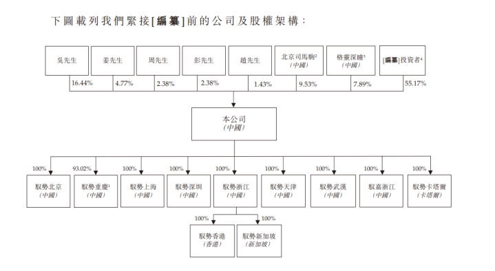 此外,吴甘沙为北京司马驹的普通合伙人,拥有18.53%权益,并且吴甘沙及周鑫根据激励计划代表购股权承授人拥有61.47%及20%权益。