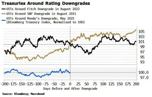 这一风险短期内将对美国国债造成压力,但尚未成为既定事实。正如Bloomberg宏观策略师SimonWhite指出,回顾美国此前两次被下调评级之后的债券市场反应——2011年8月被S&P下调、2023年8月被Fitch下调——结果并不一致。