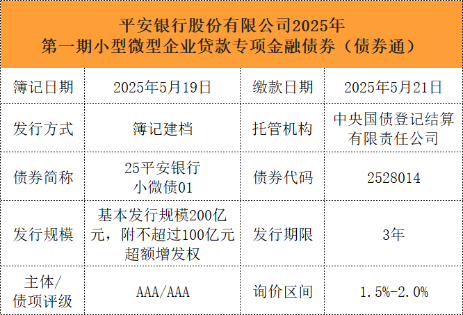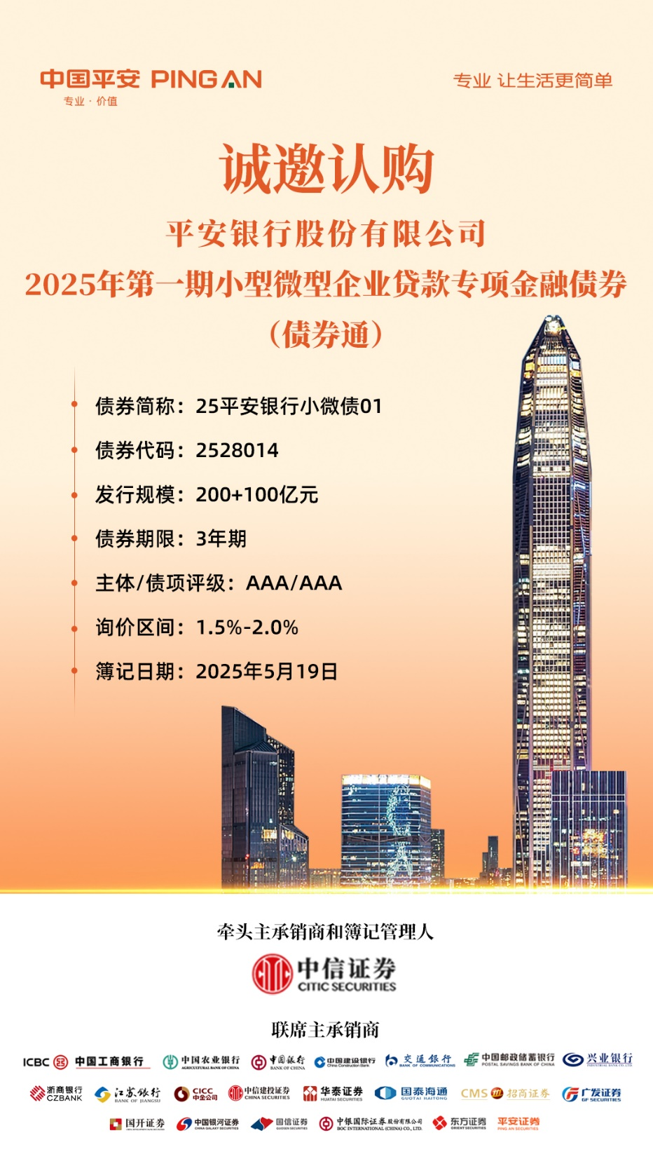 2025年5月19日,平安银行股份有限公司将在全国银行间债券市场发行2025年第一期小型微型企业贷款专项金融债券(债券通),基本发行规模200亿元,附不超过100亿元的超额增发权,主体与债项评级均为AAA。本期债券募集资金将依据适用法律和监管部门的批准专项用于发放小型微型企业贷款,加大对小型微型企业信贷支持力度,推动小型微型企业业务稳健、健康发展。
